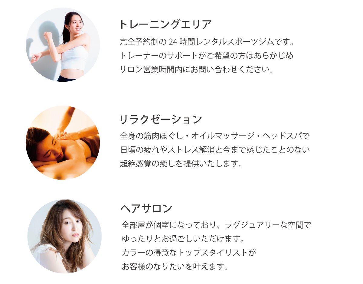 "スポーツジム×リラクゼーション×ヘアサロン"での